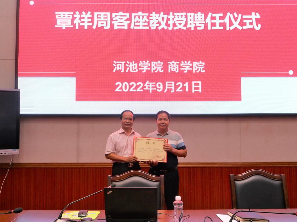 覃举东讲座前向覃祥周颁发威尼斯5139手机版客座教授聘书,指出覃祥周受聘为威尼斯5139手机版客座教授将加强学院教师队伍建设、推动学科专业建设和内涵发展具有推动意义。