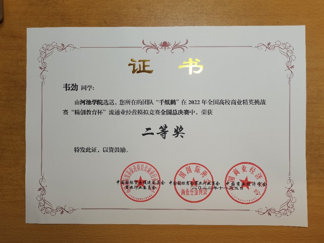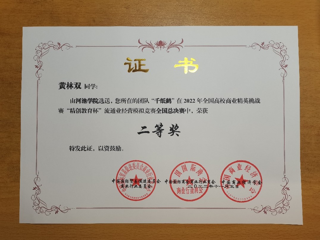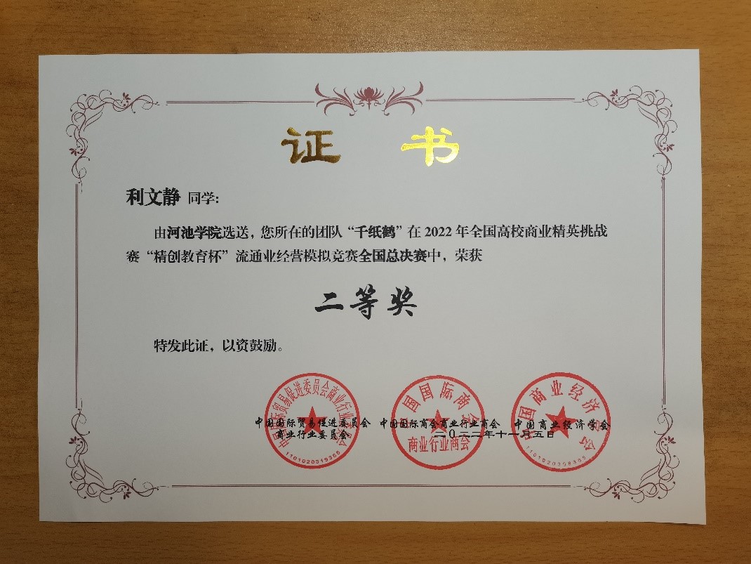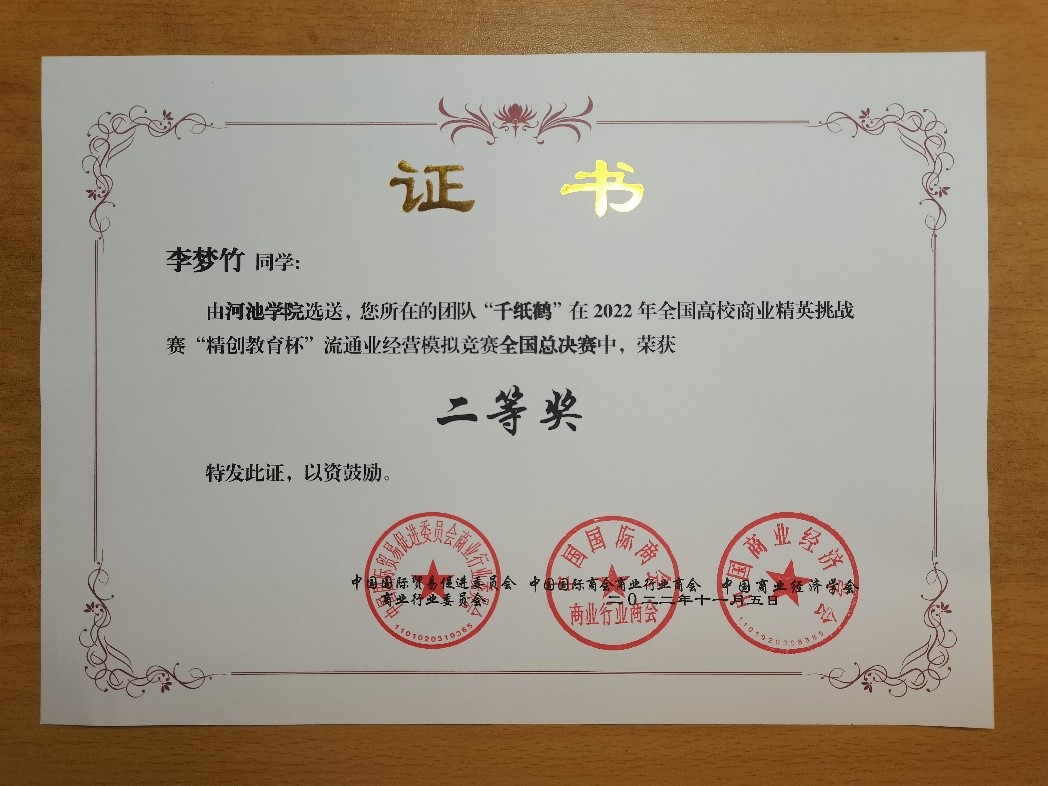 11月5日,2022年全国高校商业精英挑战赛“精创教育杯”流通业经营模拟竞赛全国总决赛分组赛顺利举行。威尼斯5139手机版人力资源管理专业李梦竹、韦劲、黄林双、利文静四位同学最终荣获全国总决赛二等奖。
