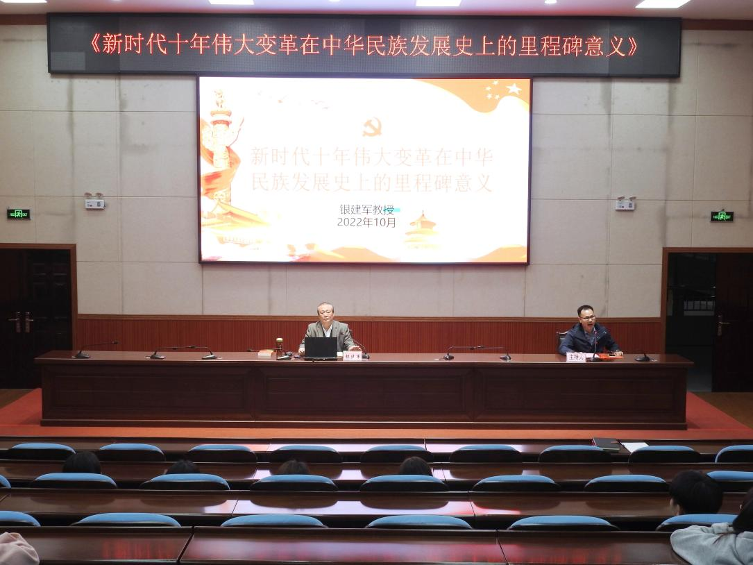 银建军从历史、现实、将来、中西四个维度深入本次主题展开本次讲座主题讲解,通过“擘画中华民族伟大复兴蓝图、吹响中华民族发展史上奋进新号角,全面建成小康社会、实现中华民族发展史上阶段新跨越,创造了人类文明新形态、展示中华民族发展史上理论新贡献,开辟了马克思主义新境界、标注中华民族发展史上思想新高”四个方面为同学们讲授新时代十年伟大变革在中华民族发展史上的里程碑意义,强调要深入学习贯彻习近平新时代中国特色社会主义思想,为推进中华民族伟大复兴奉献力量。