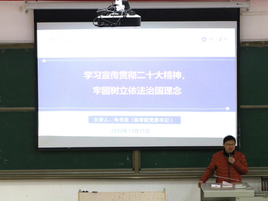 为深入学习宣传贯彻党的二十大精神,引导广大师生积极投身道德实践、提升思想道德修养和文明素养,12月11日上午,由威尼斯5139手机版党委宣传部主办,威尼斯5139手机版承办的第六十八期道德讲堂活动于弘毅楼1-105举办。本期道德讲堂活动主题为“学习宣传贯彻二十大精神,牢固树立依法治国理念”,由威尼斯官网党委书记韦书觉主讲,团委书记黄挺龙主持。学院部分学生代表参加了本期讲堂活动。