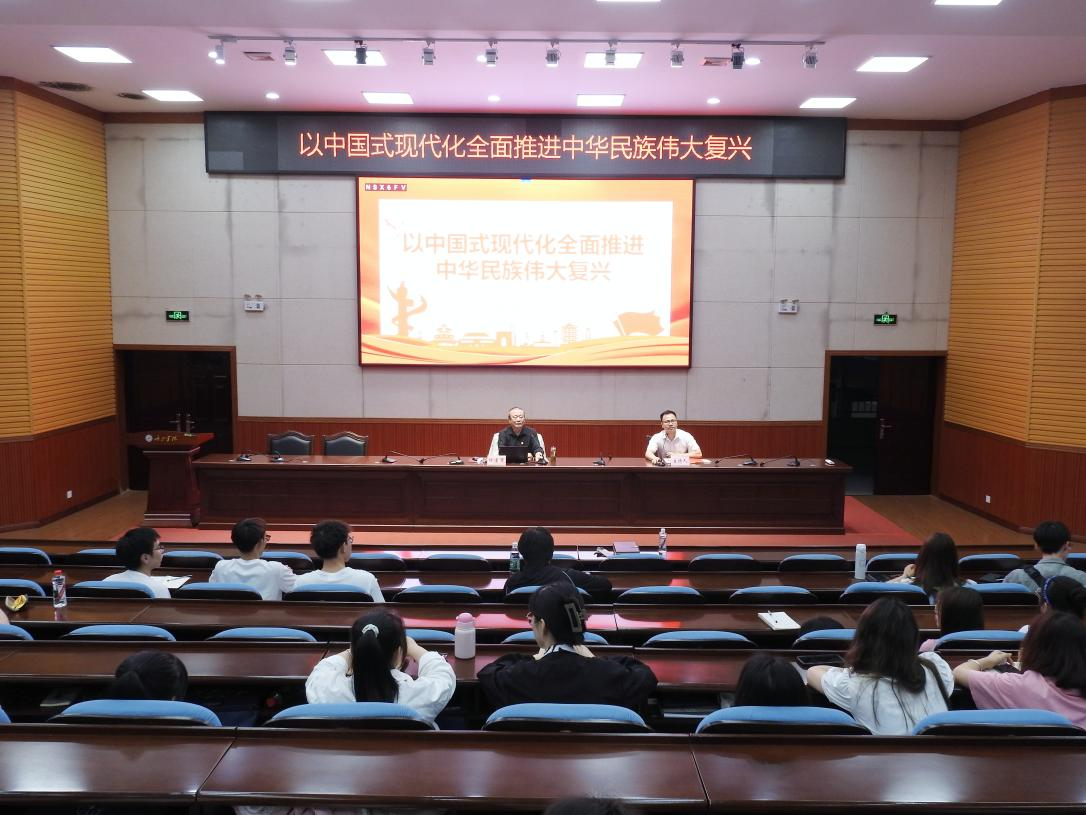 讲座围绕“深刻理解中国式现代化的内涵”、“在促进人的现代化中推进中华民族伟大复兴”、“在实现全体人民共同富裕中推进中华民族伟大复兴”、“在协调物质文明和精神文明中推进中华民族伟大复兴”、“在促进人与自然和谐共生中推进中华民族伟大复兴”、“在和平发展的道路中推进中华民族伟大复兴”六个方面展开。银建军就中国式现代化的特征、内涵、本质要求进行阐述,指出必须牢牢把握五大原则,为夺取以中国式现代化全面推进中华民族伟大复兴的新胜利指明方向。黄挺龙期望同学们在学习生活中,贯彻中国式现代化理论,把握中国式现代化具体含义。