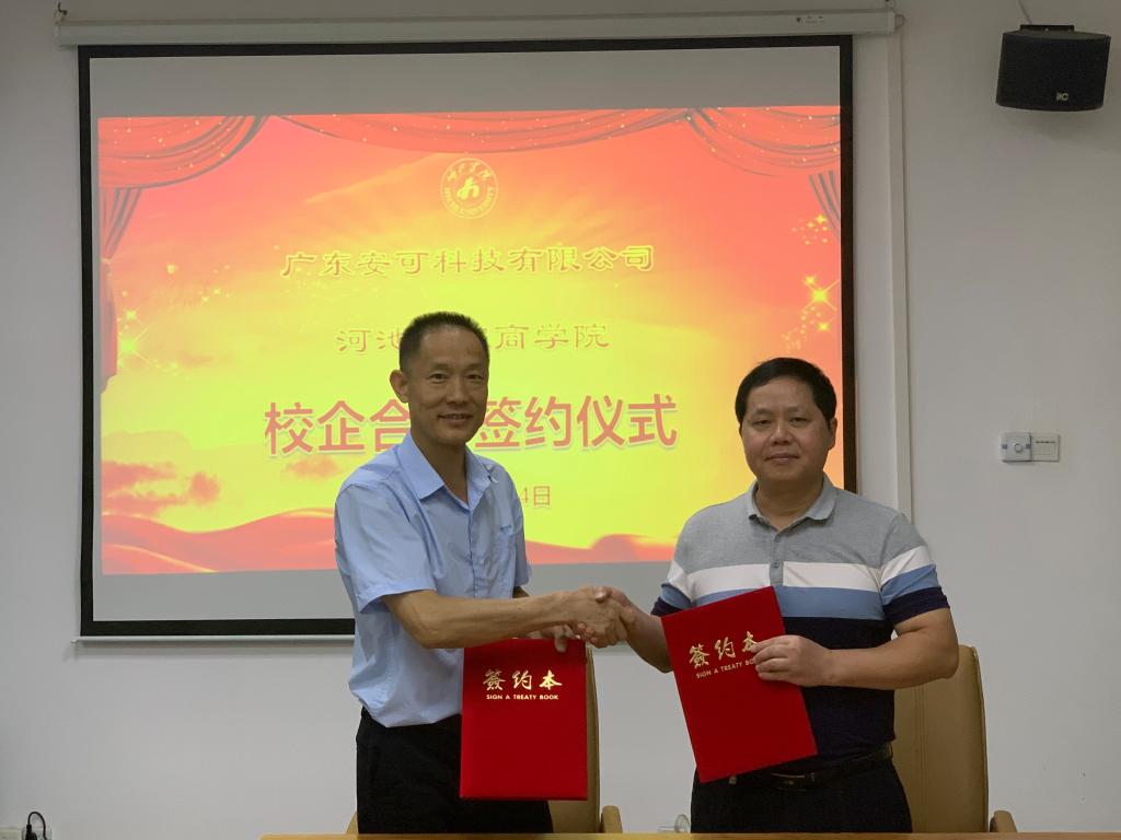 5月24日下午,威尼斯官网与广东安可科技有限公司于行政楼110室举行校企合作签约仪式。广东安可科技行政部经理王立健,威尼斯官网院长覃举东、党委副书记蓝振榕,安可科技人事部专员李明、技术部工程师梁锡武参会。仪式由威尼斯官网院长覃举东主持。